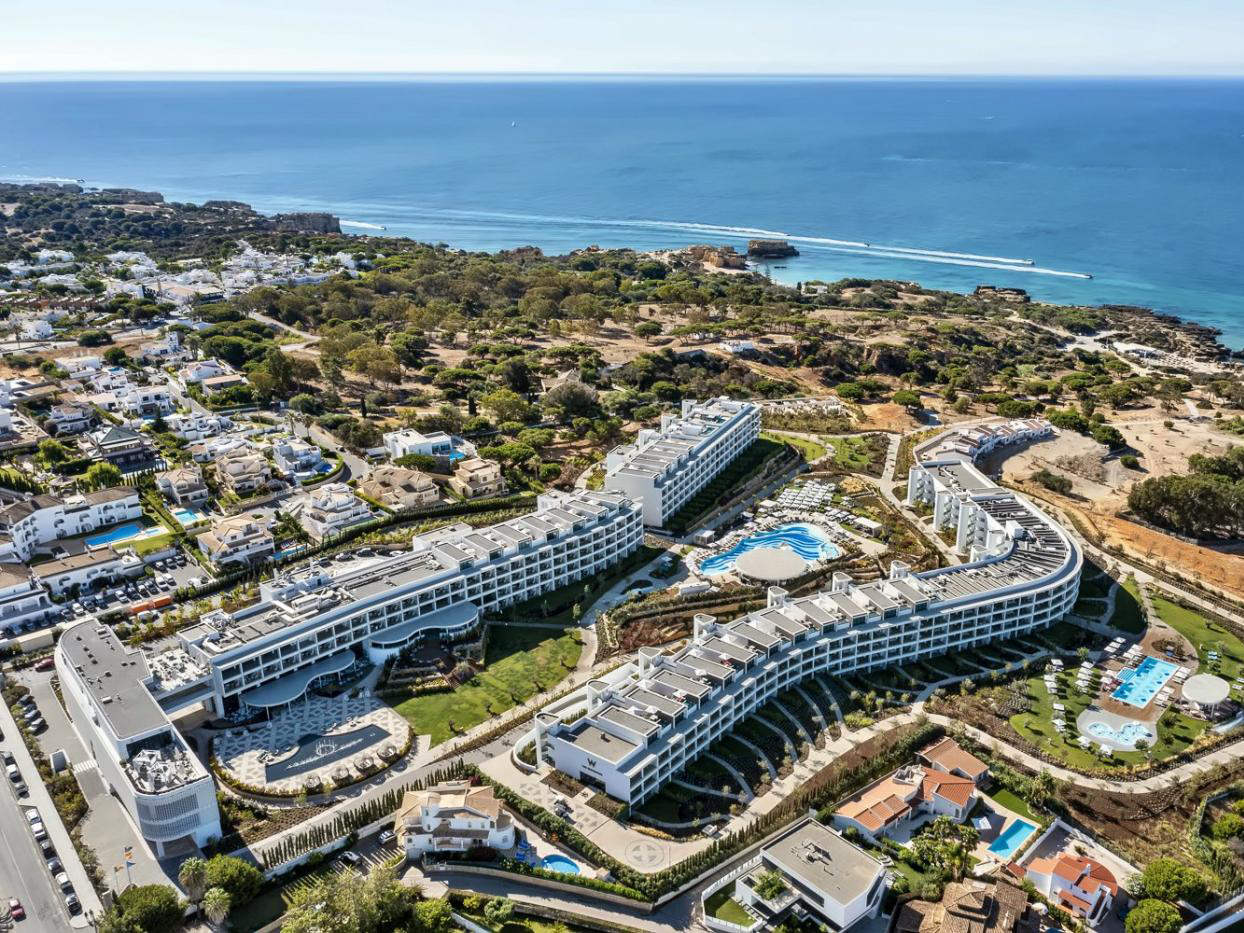 Perched dramatically above the golden beaches of Albufeira, W Algarve brings a vibrant, fashion-forward flair to Portugal’s southern coast. The architecture, sculpted like waves in motion, sets the tone for a resort that’s anything but ordinary. Inside, Moorish patterns meet coastal hues—cerulean blues, sandy neutrals, and sunshine yellows—layered with bespoke artwork, ceramics, and textures that mirror the energy of the Atlantic just beyond.